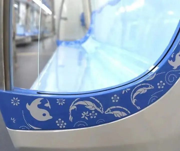 2号线列车以“江豚戏水”为主题,将国家非物质文化遗产蓝印花布设计元素融入到设计中,并获得工业创意设计奖与外观专利授权,让市民在便捷出行的同时沉浸式体验南通传统文化魅力。