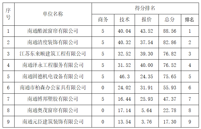 *注:南通正爵装饰工程有限公司 报价响应函未填税率,作废标处理;